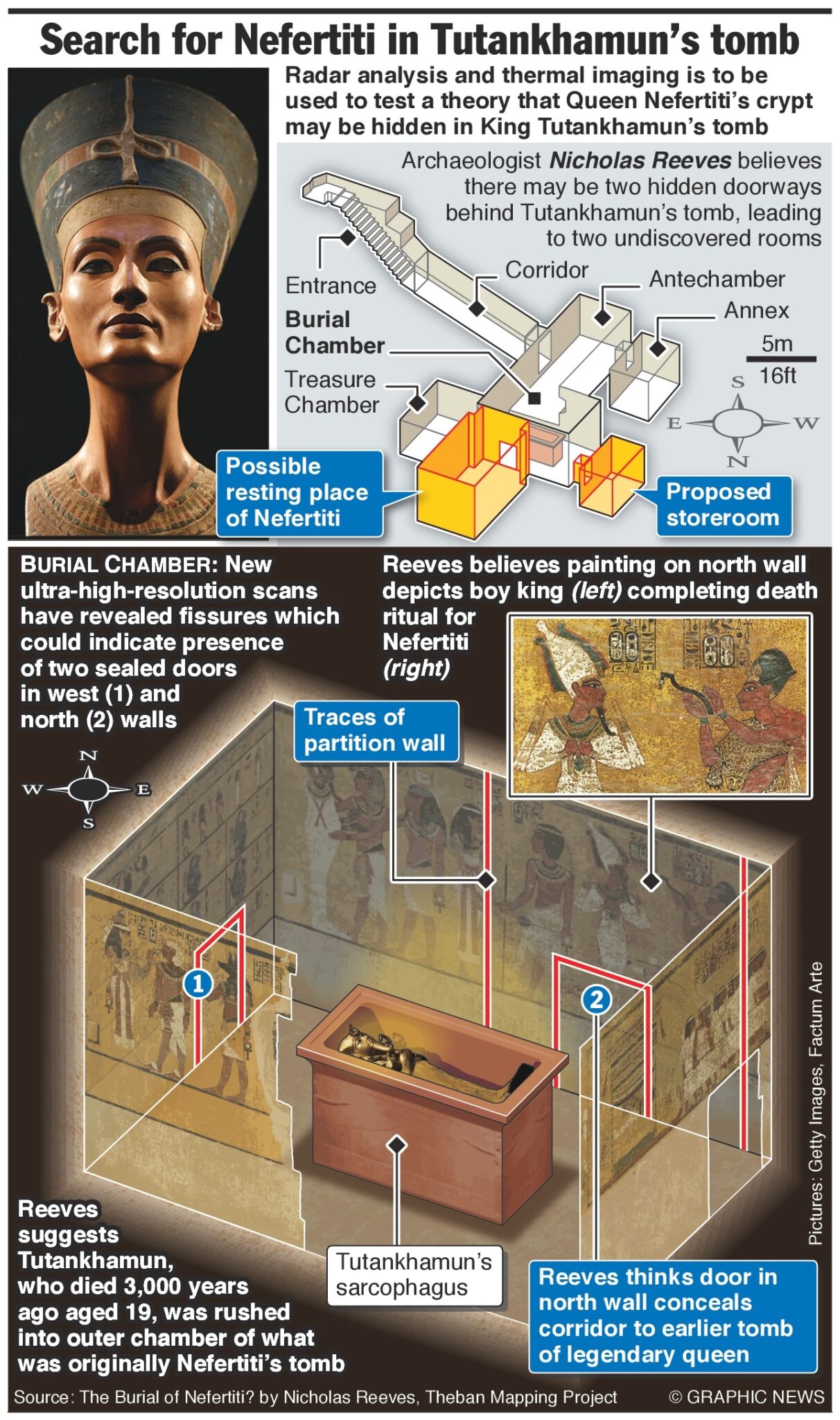 The mummy of Meritaten has not been found, but Antiquities Minister Mamduh al-Damati said on Sunday it could be in a secret chamber in Tutankhamun’s tomb. Archaeologists are currently scanning Tutankhamun’s tomb in the Valley of Kings after British archaeologist Nicholas Reeves claimed that it has a secret chamber. Dr Reeves says the chamber could be the burial site of Nefertiti, whose mummy also has not been found. “All these possibilities exist. Step by step we will be able to better understand the time of king Tutankhamun,” Mr Damati said.