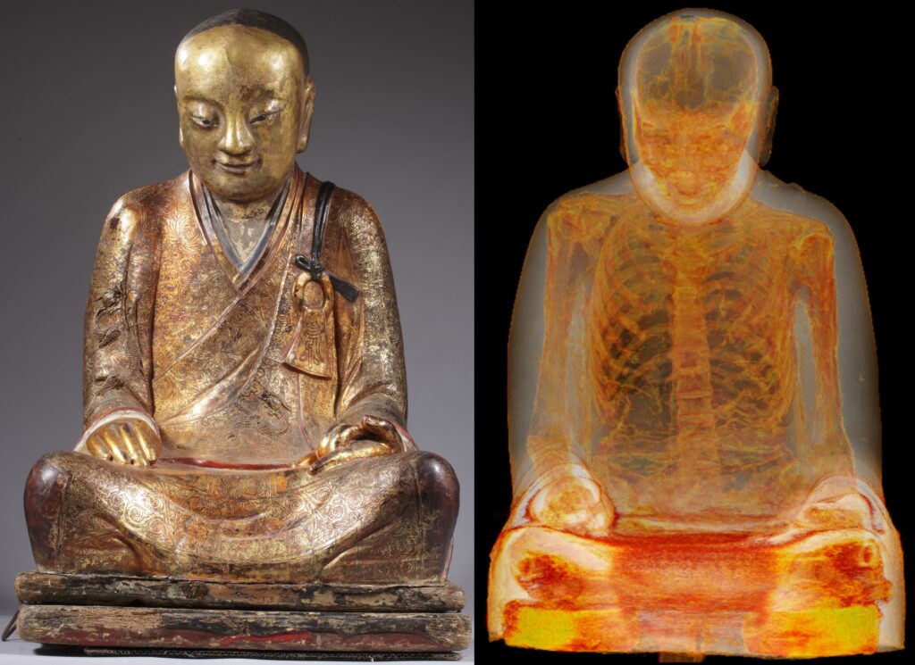 A CT-scanof an ancient Buddha statue has led to the unique discovery of a mummified Chinese monk, dating back to the 11th century and preserved in the same position as its exterior statue.