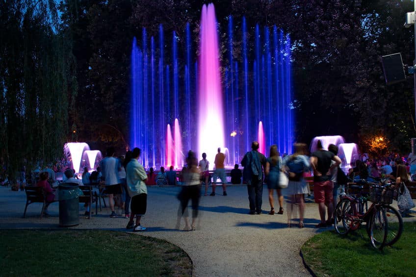 The musical fountain on Margaret Island is considered to be one of the largest fountains in Europe, with its 35 meter diameter pool containing 400 cubic meters of water, and a more than 1000 square meters water surface. It jets the water up to 10 meters. 250 energy saving LED lights are providing the mood lighting in the evening.