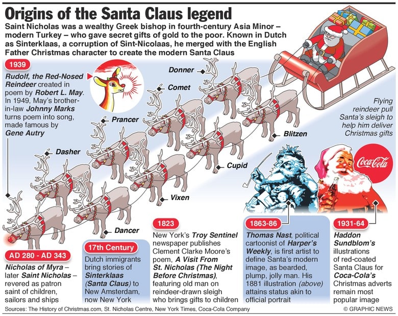The true story of Santa Claus begins with Nicholas, who was born during the third century in the village of Patara. At the time the area was Greek and is now on the southern coast of Turkey. His wealthy parents, who raised him to be a devout Christian, died in an epidemic while Nicholas was still young. Obeying Jesus’ words to “sell what you own and give the money to the poor,” Nicholas used his whole inheritance to assist the needy, the sick, and the suffering. He dedicated his life to serving God and was madeBishop of Myra while still a young man. Bishop Nicholas became known throughout the land for his generosity to those in need, his love for children, and his concern for sailors and ships.