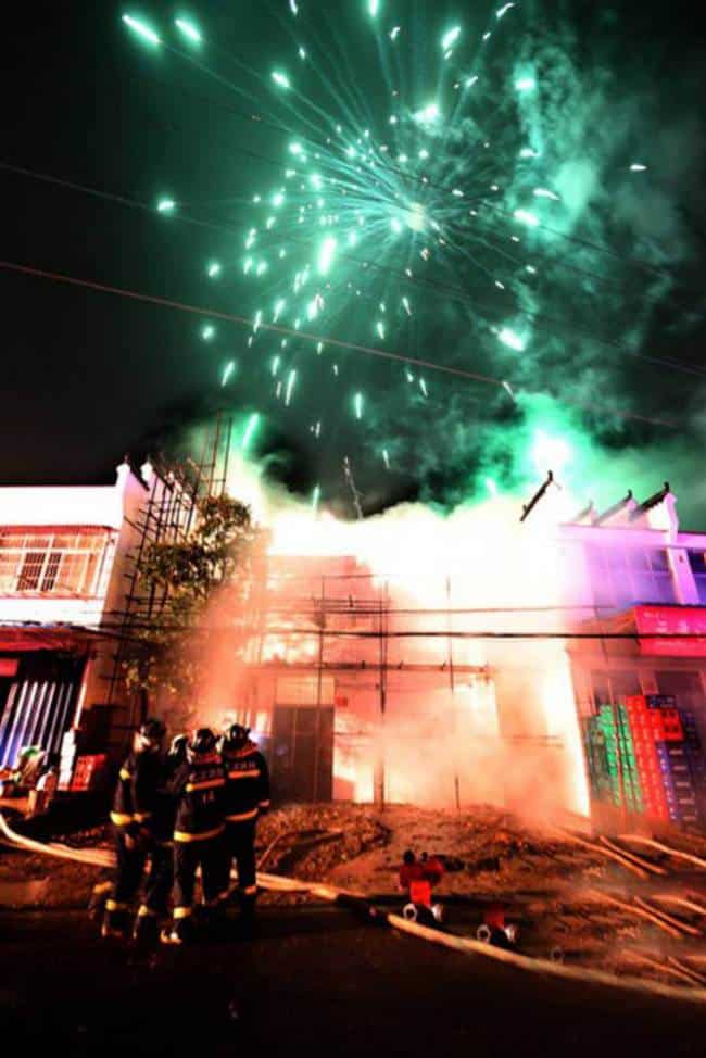 The whole building was destroyed in an explosion caused by the fire, sending tens of thousands of pounds worth of fireworks up in smoke. As firefighters tackled the blaze in Penggang village, Hubei province, locals were treated to a spectacular two-hour fireworks display. Mr Ho added: ‘It is a tragedy but at least my father escaped, he ran out and was unhurt.’