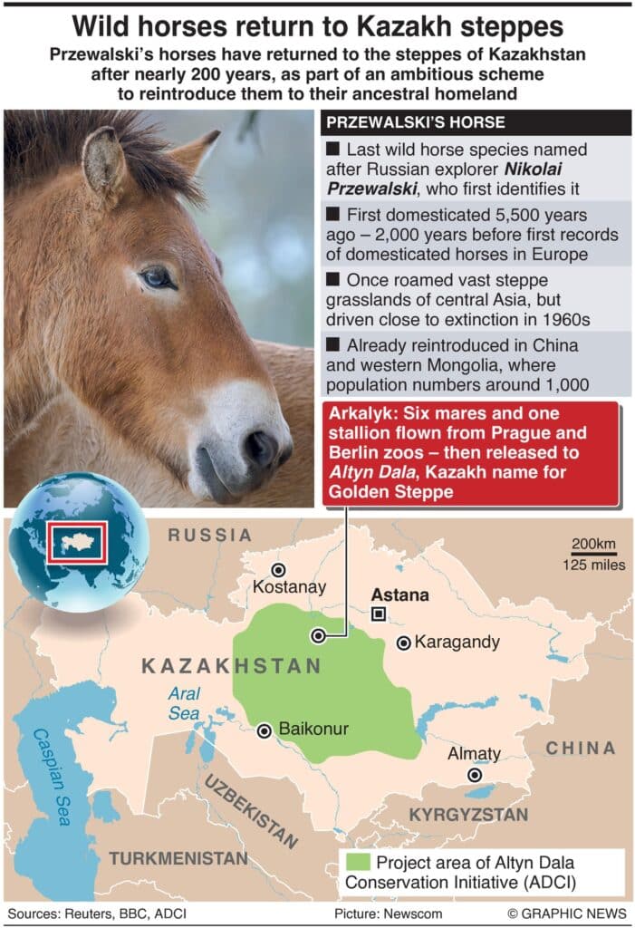 Przewalski’s horses have returned to the steppes of Kazakhstan after nearly 200 years, part of an ambitious scheme to reintroduce the world’s last wild horses to their original habitats.
