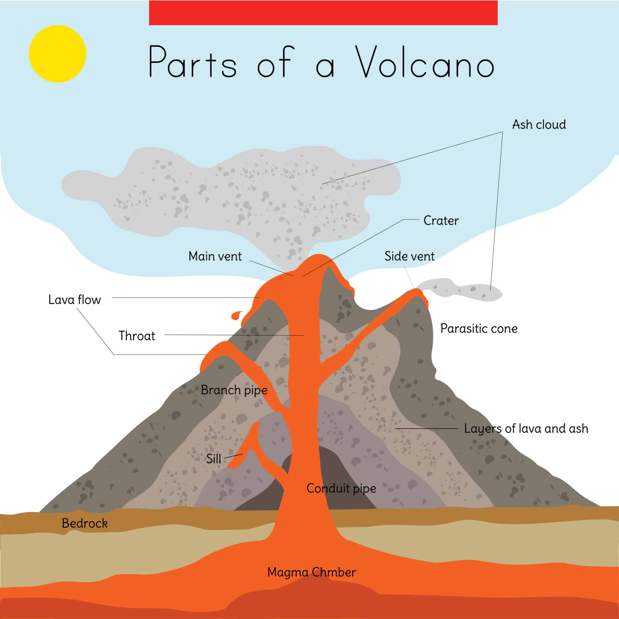 A volcano is a mountain with a hole where lava (hot, liquid rock) comes from a magma chamber under the ground. Most volcanoes have a volcanic crater at the top. When a volcano is active, materials come out of it. The materials include lava, steam, gaseous sulphur compounds, ash and broken rock pieces.