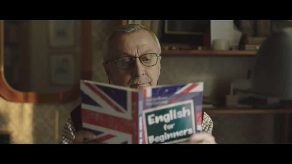 It features a grandfather, who orders an “English for beginners” set from the website.