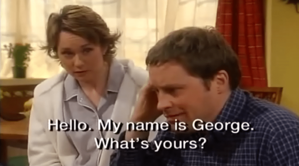 George: No. Oh, sorry. I’ve slipped one. Right, I’ve got it. Hello. My name’s George. What’s yours?